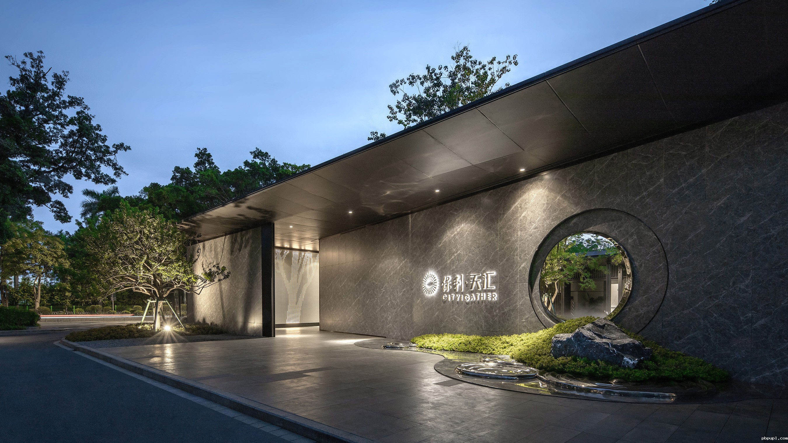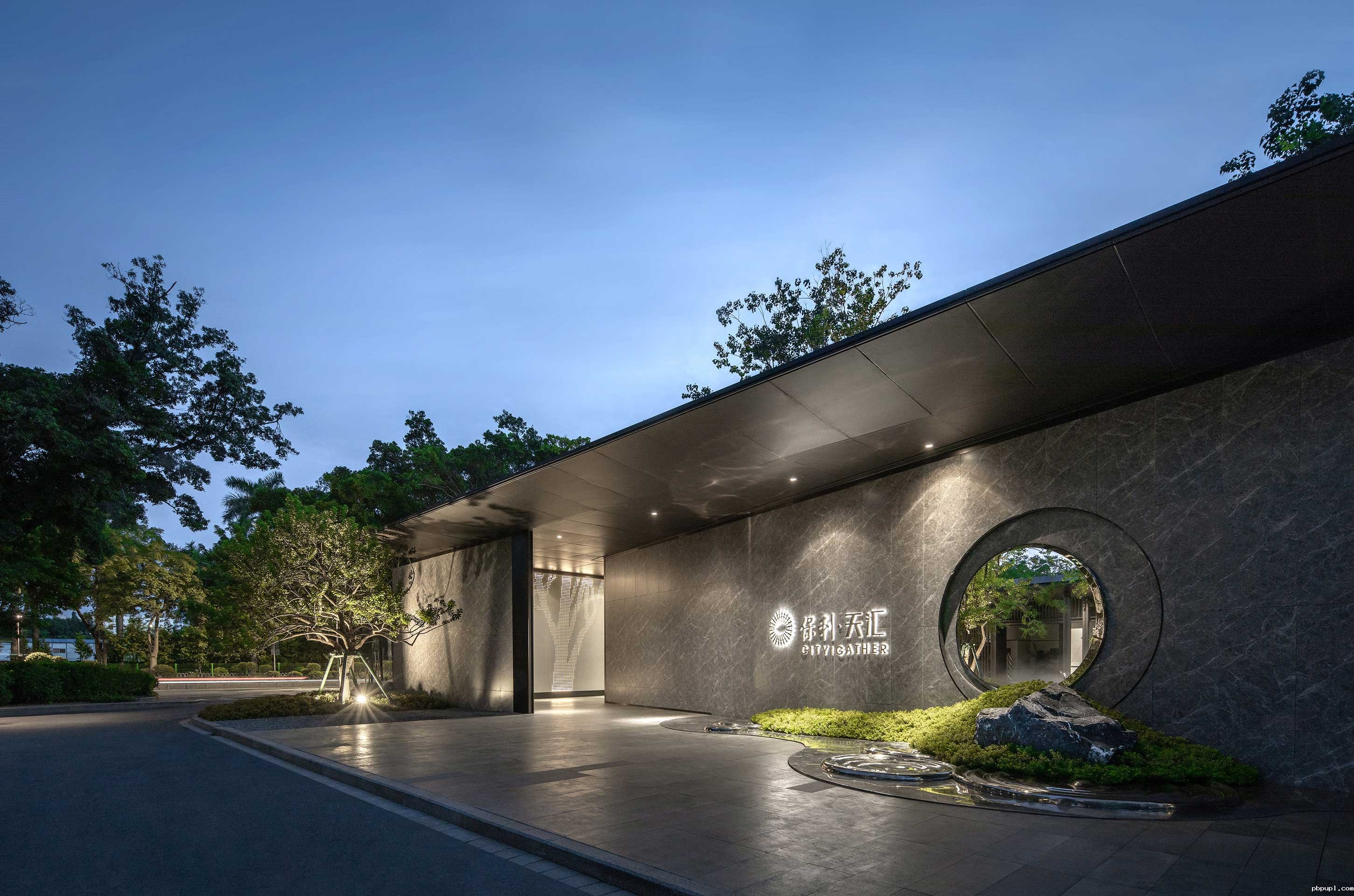 门楼前的假山加水纹布品点缀,似看尽繁华,简约的造型用以大理石铺面加金属收边,尽显厚重大气,圆形框景环环相绕,引人心神。