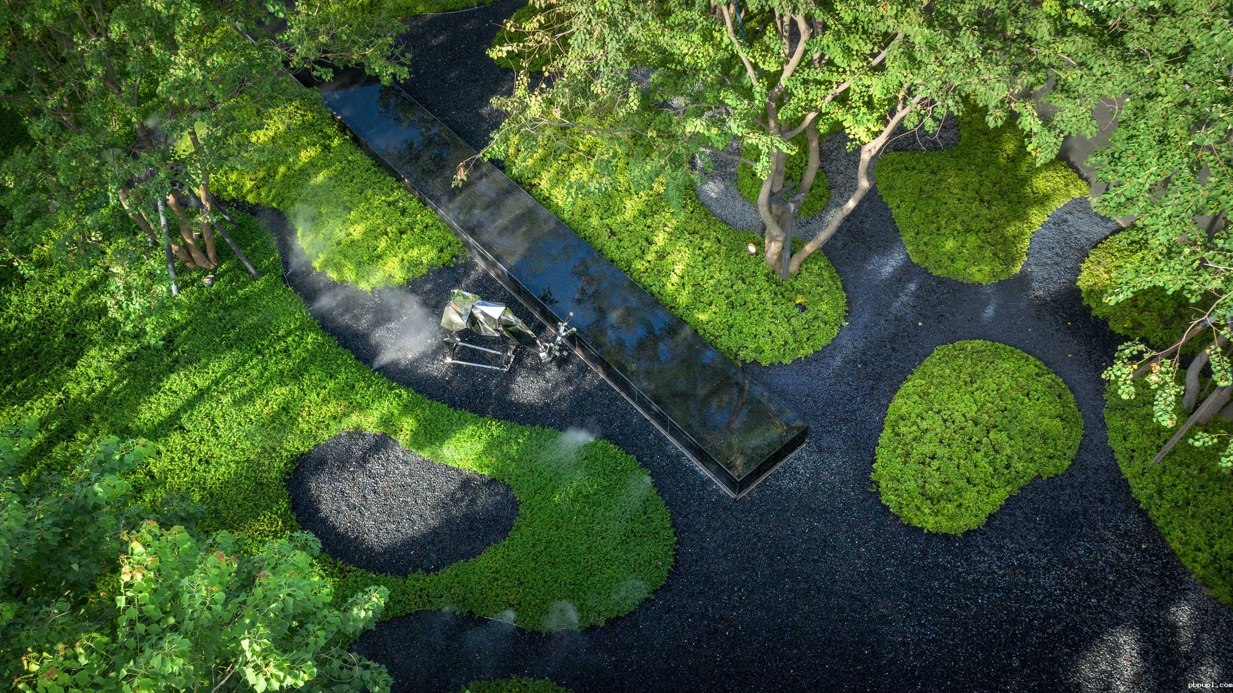现代艺术感雕琢的金属小鹿在条形水景前俯身轻啄,形成了一幅丹青画作。