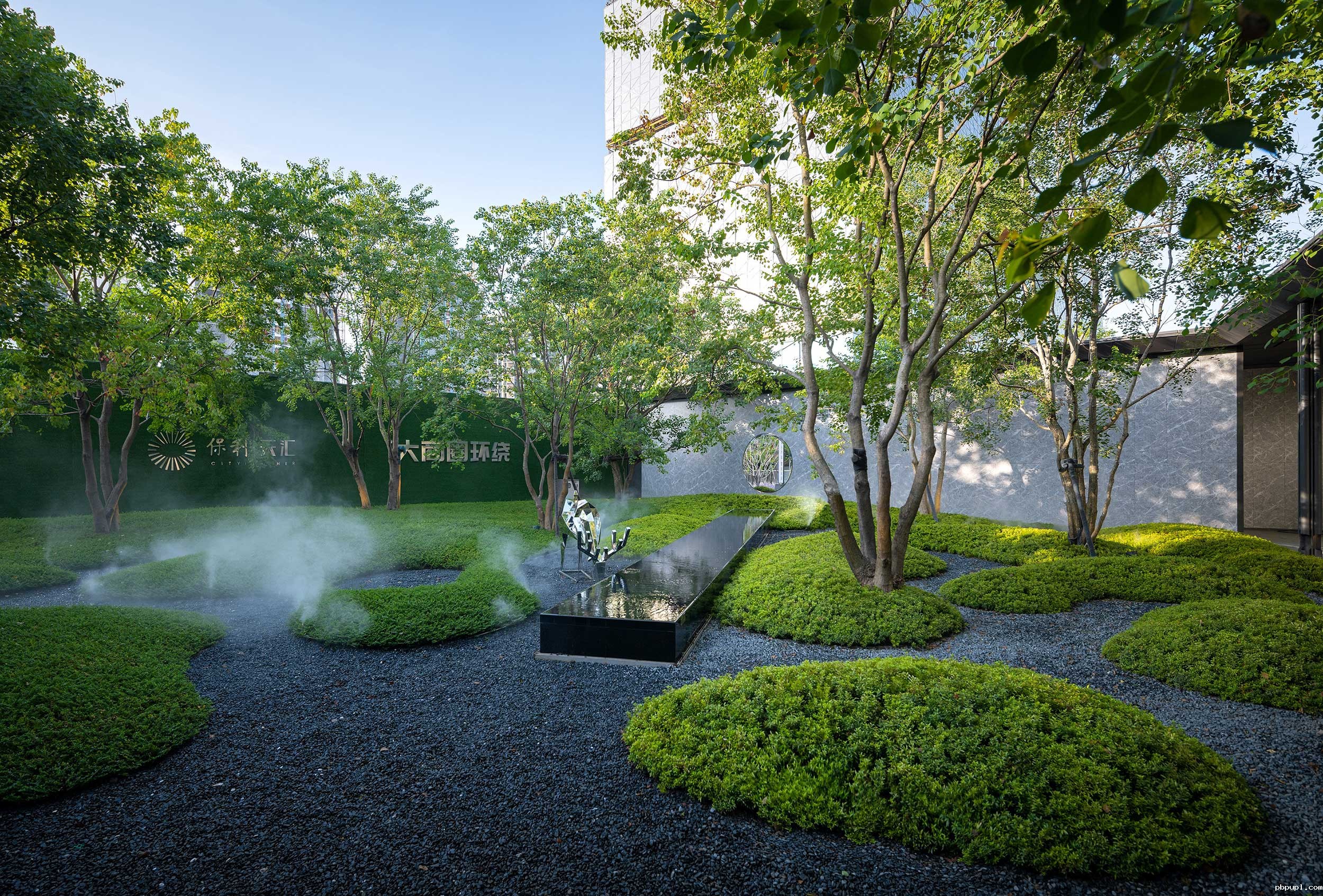 闲云潭影日悠悠,阳光透过树影从“云帆”主题雕塑中穿过,倒影重重叠叠映入静谧水景与白色的格栅墙之上,一份傍晚清闲惬意的氛围跃然而上。