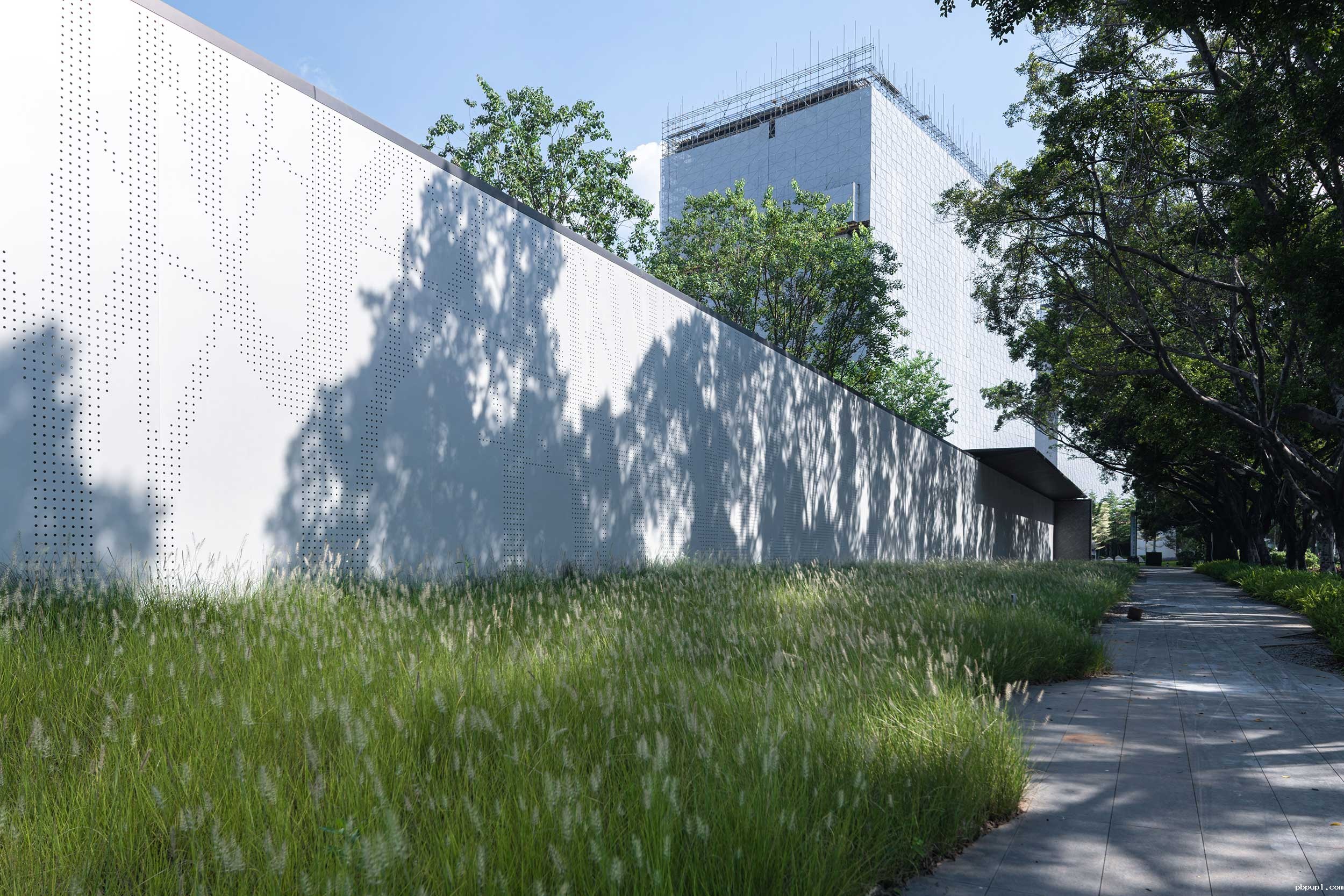 白色回廊与一旁阵列排布的树木相互照应,透过大面的玻璃窗,清爽的气息让人仿佛置身于轻松、舒适、自在的大自然中。